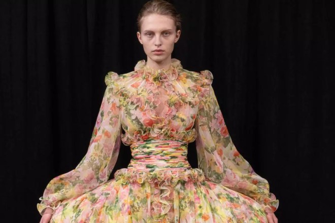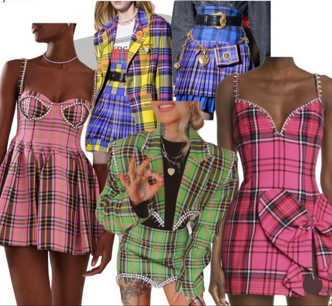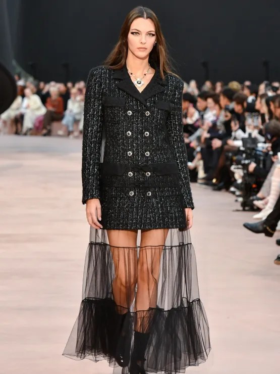 Os looks de destaque incluíram um blusão de tweed verde-limão combinado com uma saia drapeada de cetim azul-bebê; um vestido preto de cetim com decote halter, preso por um cinto utilitário com bolsos de aba; e um casaco de tweed trespassado sobre uma saia plissada em camadas com acabamento em renda.